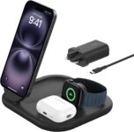 Design: Foldable stand with MagSafe compatibility.Charging Speed: iPhone 15W, AirPods 5W, Watch 3W.